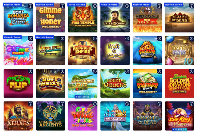 A proposito delle novità, inoltre, selezionando la tab apposita non compariranno solo gli ultimi titoli aggiunti, ma anche quelli in promo! Cliccando sul tasto info, presente in alto a destra su ogni slot, inoltre, sarà semplicissimo accedere alle informazioni principali della slot machine, alla tabella dei pagamenti e ai simboli e caratteristiche.